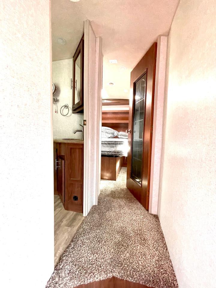 45W Solar Panel, 1.5 CuFt Convection Microwave, 10 Cu Ft LP/AC Refrigerator, Daylighter Kitchen Skylight, Lighted Toe Kick, Arctic Fox Clock and Door Mat, Ceiling Fan, 16 Gal Gas/Electric Water Heater, Coleman AC w/Digital Thermostat, 12V LED Awning, TV Antenna, Solid Surface Countertops, LED Smart TV, Furrion Cooking Suite, Fantastic Fan, Glass Shower Enclosure, TruRest Mattress w/Ultra Deck Sleep System, USB Charge Ports at Dinette and Bed.