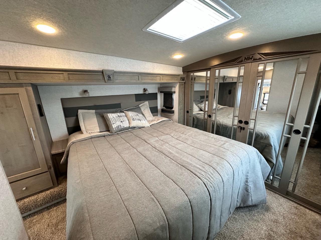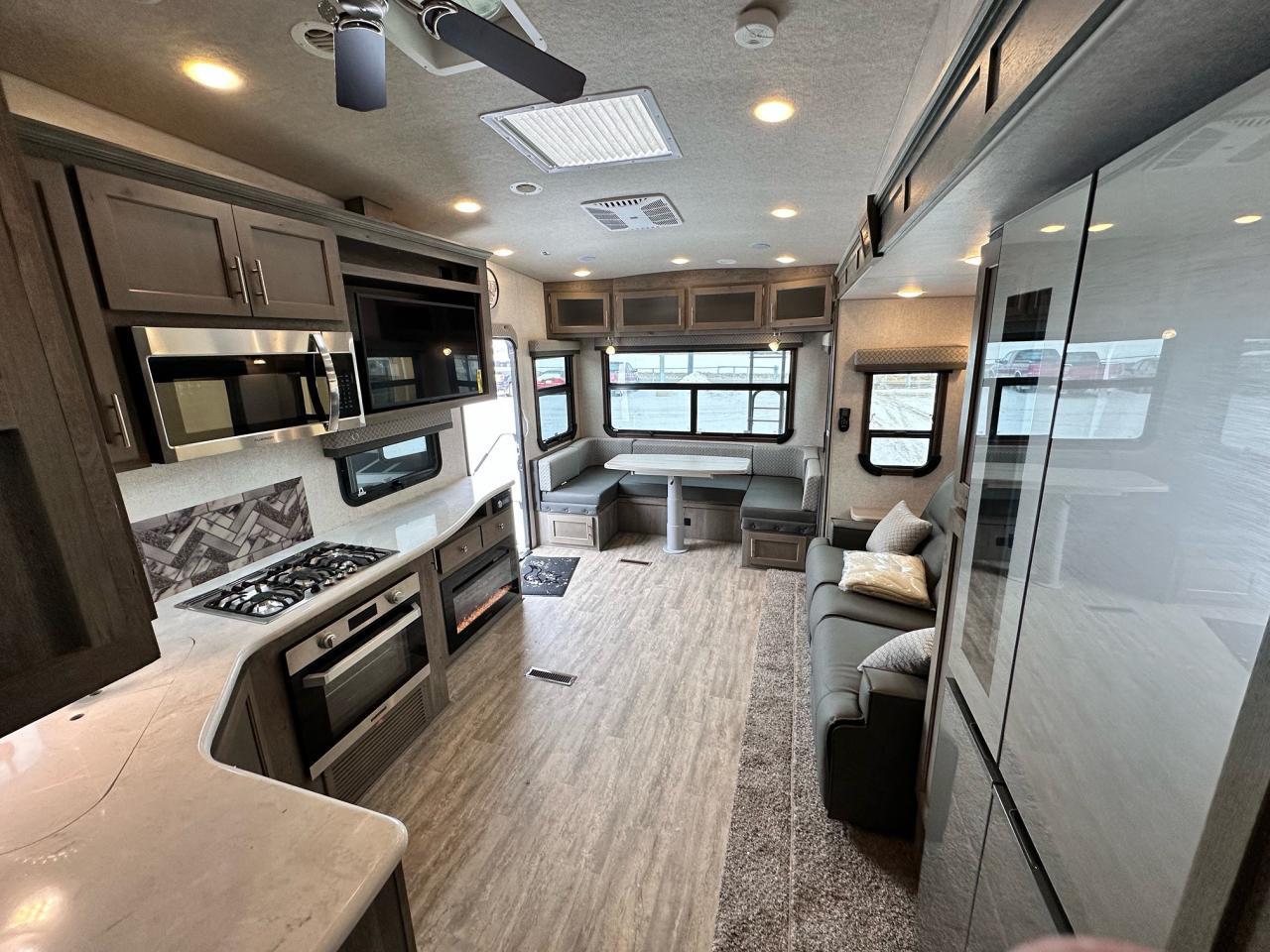 SolX4 400W Solar Package, 1.5 CuFt Convection Microwave, 12V Stainless Steel Refrigerator, Daylighter Kitchen Skylight, Lighted Toe Kick, Arctic Fox Clock and Door Mat, Ceiling Fan, 16 Gal Gas/Electric Water Heater, Coleman AC w/Digital Thermostat, 12V LED Awning, TV Antenna, Solid Surface Countertops, LED Smart TV, Furrion Cooking Suite, Fantastic Fan, Glass Shower Enclosure, TruRest Mattress w/Ultra Deck Sleep System, USB Charge Ports at Dinette and Bed.