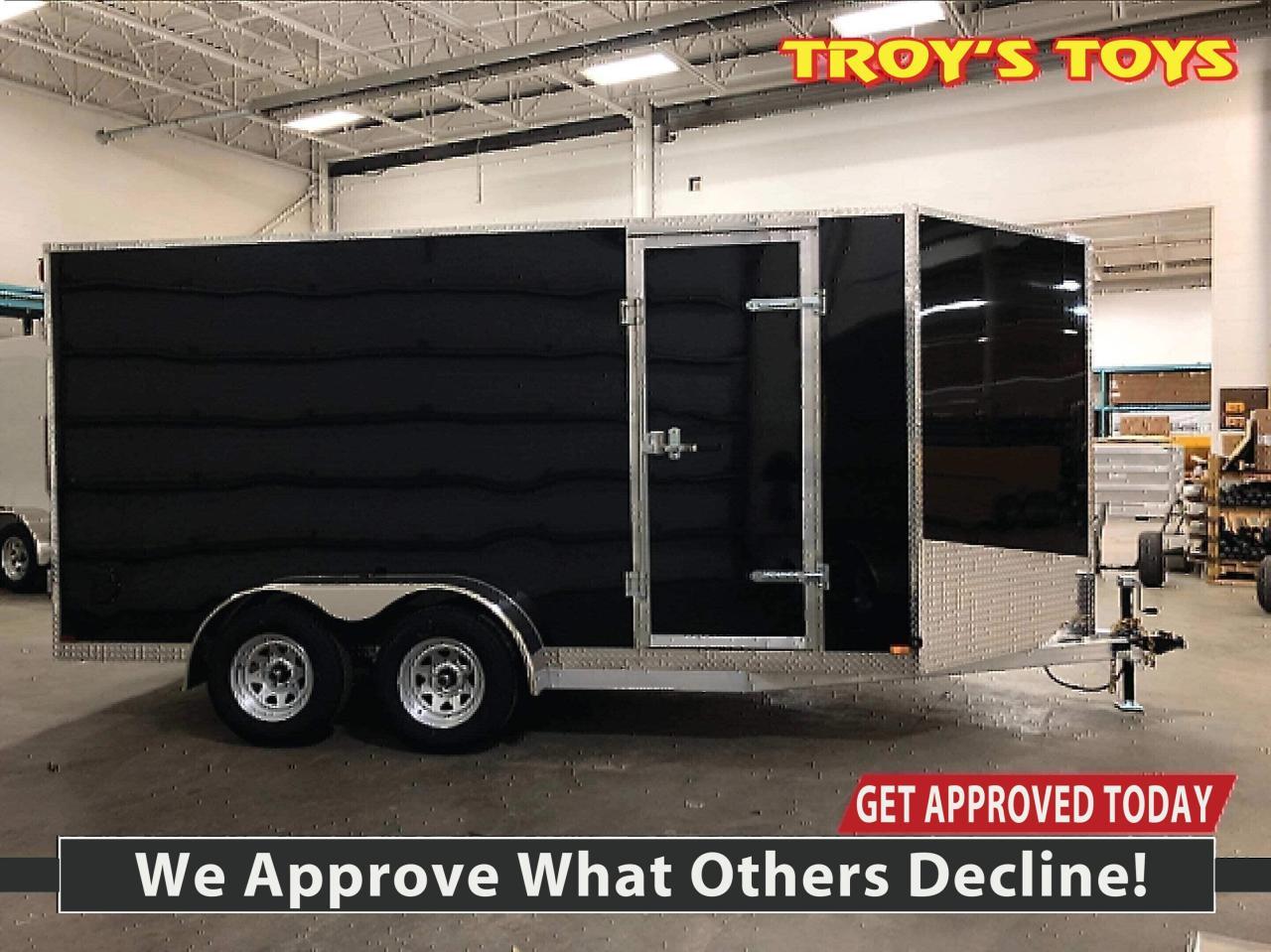 Text or Call 519-400-6666 for quick response! Canadian Built Trailers - Cargo Trailers Custom build your trailer at Troys Toys today! Visit our website www.troystoys.net for full inventory. OVER 100 TRAILERS IN STOCK!! *Prices do not include sales tax or registration* This Model: 2019 CTC 7X14 V-Nose (Size does not include the v-nose; size plus the v-nose) HEIGHT: 6'6" COLOUR: Black FRAME: Aluminum REAR DOOR: Ramp Door (W/ Spring Assist) 15 RADIAL TIRES ON: 15 Galvanized Wheels AXLE(S) TYPE: Tandem, dropped AXLE(S) CAPACITY: 3500lb/ea HITCH: 2 5/16 Ball OTHER OPTIONS: RV Latch Standard Options with all CTC Trailers: Screwless exterior cladding (.30) with checker plate trim all around Polished aluminum fenders One piece aluminum roof Angled diamond checker plate stone guard on v-nose 16 o/c square tubing frame (Roof, Walls & Floor) Curb-side man-door 3/4 fir plywood floor 3/8 fir plywood on walls Exterior L.E.D lighting Side Vents Bar Lock For the full 2019 Canadian Trailer Company Lineup, please visit www.canadiantrailercompany.net All trailers come with a 3-year manufacturers warranty. Some conditions apply. See store for details.