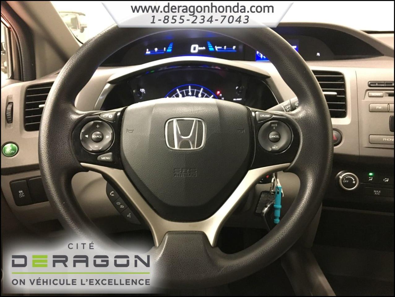 Honda Civic LX 1.8L + A/C + BLUETOOTH + D?MARREUR ? DISTANCE LX 1.8L+A/C+BLUETOOTH+D?MARREUR ? DISTANCE+R?GULATEUR DE VITESSE 2012Régulateur de vitesse, Essuie-glaces intermittents, Anti-démarreur, Freins ABS, Contrôle de stabilité, Coussin gonflable conducteur, Coussins gonflables latéraux, Démarreur à distance, Lecteur CD, Lecteur MP3, Tachymètre, Vitres électriques, Air climatisé, Commandes audio au volant, Lampes de lecture arrière, Volant ajustable, Enjoliveurs, Tapis protecteurs, Radio AM/FM, Phares automatiques, Rétroviseur électrique, Direction assistée, Télédéverrouillage, Rétroviseurs chauffants, Coussins gonflables arrière pour la tête, Sièges tissu, Freins à disque, Rétroviseurs électriques, Antipatinage, Verrous de sécurité pour enfants, Sièges baquets, Technologie Bluetooth intégrée, Climatisation