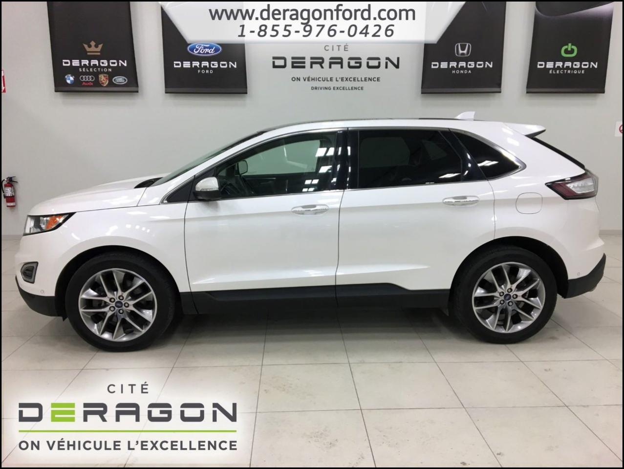 Ford Edge TITANIUM + AWD + TOIT + NAVIGATION TITANIUM + AWD + TOIT + NAVIGATION 2015Régulateur de vitesse, Toit ouvrant, Essuie-glaces intermittents, Essuie-glace arrière, Anti-démarreur, Freins ABS, Contrôle de stabilité, Coussin gonflable conducteur, Coussins gonflables latéraux, Démarreur à distance, Lecteur CD, Lecteur MP3, 8 Haut-parleurs, Portes électriques, Sièges électriques, Tachymètre, Vitres électriques, Air climatisé, Intérieur en cuir, Climatisation deux zones, Commandes audio au volant, Sièges arrières rabattables, Sièges chauffants, Siège mémoire, Volant ajustable, Aileron, Tapis protecteurs, Vitres teintées, Phares haute intensité, Ordinateur de bord, Tout équipé, Caméra de recul, Radio AM/FM, Rétroviseurs, Volant gainé de cuir, Phares automatiques, Rétroviseur électrique, Sièges arrières chauffants, Direction assistée, Télédéverrouillage, Rétroviseurs chauffants, Banquette arrière divisé, Siège à réglage électrique, Système d\'alarme, Coussins gonflables arrière pour la tête, Siège conducteur - soutien lombaire, Siège passager - soutien lombaire, Essuie-glace détecteur de pluie, Démarrage sans clé, Freins à disque, Sièges chauffants - Avant, Rétroviseurs électriques, Jantes en alliage, Antipatinage, Phares antibrouillards, Verrous de sécurité pour enfants, Système de surveillance de la pression des pneus, Sièges baquets, Technologie Bluetooth intégrée, Port USB, Climatiseur automatique, Aide au stationnement (capteurs), Rétroviseur à atténuation automatique, Aluminium, Climatisation