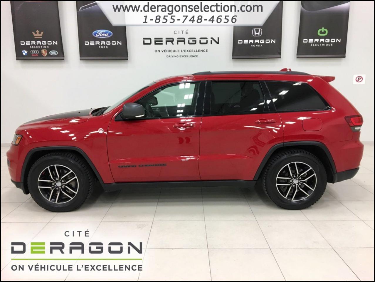Jeep Grand Cherokee TRAILHAWK + LUXURY GROUP + ACTIVE GROUP TRAILHAWK + LUXURY GROUP + ACTIVE GROUP 2017Régulateur de vitesse, Toit ouvrant, Essuie-glaces intermittents, Essuie-glace arrière, Anti-démarreur, Freins ABS, Contrôle de stabilité, Coussin gonflable conducteur, Coussins gonflables latéraux, Démarreur à distance, Lecteur MP3, Portes électriques, Sièges électriques, Tachymètre, Vitres électriques, Air climatisé, Intérieur en cuir, Climatisation deux zones, Commandes audio au volant, Sièges arrières rabattables, Sièges chauffants, Siège mémoire, Volant ajustable, Tapis protecteurs, Attelage remorque, Phares haute intensité, Ordinateur de bord, Tout équipé, Caméra de recul, Radio AM/FM, Rétroviseurs, Volant gainé de cuir, Phares automatiques, Rétroviseur électrique, Sièges arrières chauffants, Direction assistée, Télédéverrouillage, Rétroviseurs chauffants, Siège à réglage électrique, Système d\'alarme, Coussins gonflables arrière pour la tête, Siège conducteur - soutien lombaire, Siège passager - soutien lombaire, Siège refroidissant, Démarrage sans clé, Freins à disque, Sièges chauffants - Avant, Rétroviseurs électriques, Jantes en alliage, Antipatinage, Phares antibrouillards, Verrous de sécurité pour enfants, Système de surveillance de la pression des pneus, Sièges baquets, Technologie Bluetooth intégrée, Climatiseur automatique, Aide au stationnement (capteurs), Coussin gonflable - Commutateur de mise en/hors fo, Roue de secours - Temporaire, Rétroviseur à atténuation automatique, Aluminium, Climatisation, Volant chauffant