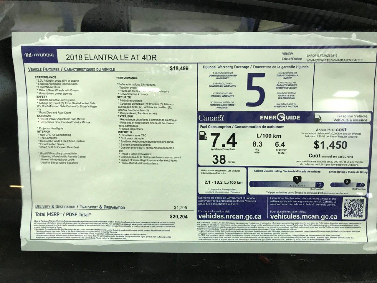 Hyundai Elantra LE BLUETOOTH SI?GES CHAUFFANTS 2018Essuie-glaces intermittents, Anti-démarreur, Freins ABS, Contrôle de stabilité, Coussin gonflable conducteur, Coussins gonflables latéraux, Lecteur MP3, Volant ajustable, Tapis protecteurs, Rétroviseur électrique, Direction assistée, Rétroviseurs chauffants, Coussins gonflables arrière pour la tête, Démarrage sans clé, Sièges chauffants - Avant, Antipatinage, Verrous de sécurité pour enfants, Système de surveillance de la pression des pneus, Sièges baquets