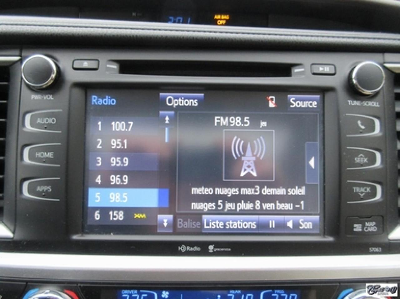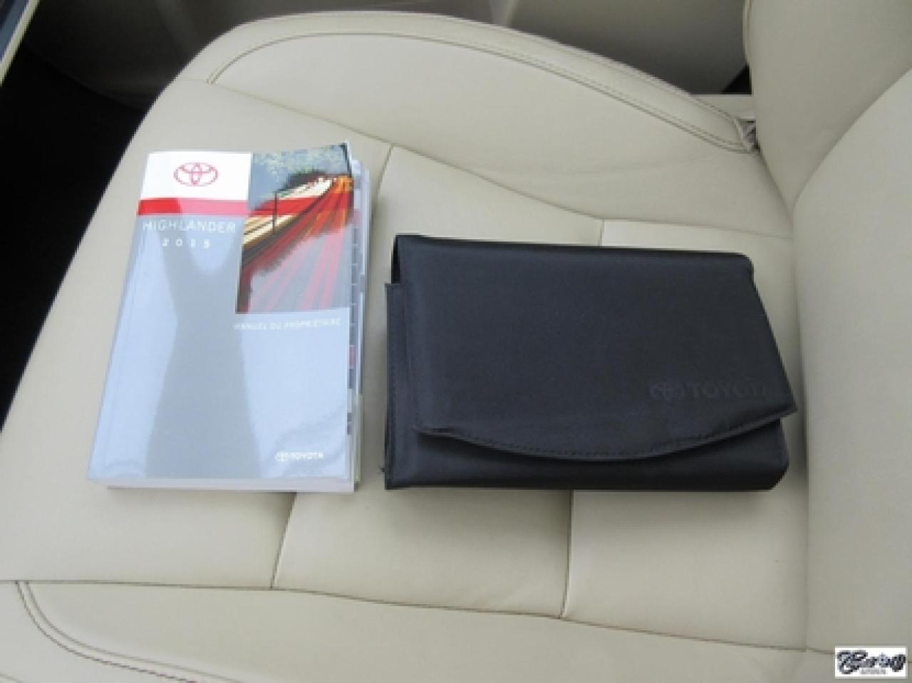 Toyota Highlander Xle V6 Awd 2015\n\nRégulateur de vitesse, Toit ouvrant, Essuie-glaces intermittents, Essuie-glace arrière, Anti-démarreur, Freins ABS, Contrôle de stabilité, Coussin gonflable conducteur, Lecteur CD, Lecteur MP3, Coffre - Ouverture à distance, Miroirs chauffants, Portes électriques, Sièges électriques, Tachymètre, Vitres électriques, Air climatisé, Intérieur en cuir, Banquette de troisième rangée, Chauffage arrière, Climatisation deux zones, Commandes audio au volant, Sièges arrières rabattables, Sièges chauffants, Volant ajustable, Aileron, Tapis protecteurs, Vitres teintées, Attelage remorque, Radio satellite, Ordinateur de bord, Caméra de recul, Radio AM/FM, Protège-capot, Direction assistée, Télédéverrouillage, Système d'alarme, Rétroviseurs électriques, Jantes en alliage, Antipatinage, Phares antibrouillards, Coussins gonflables, Support à bagages, Verrous de sécurité pour enfants, Système de surveillance de la pression des pneus, Dégivreur de lunette arrière, Miroirs ajustables de l'intérieur, Sièges baquets, Technologie Bluetooth intégrée, Port USB, Climatiseur automatique, Système HomeLink\n\nWOW!!! Blanc perle intérieur en cuir tan, 4 PNEUS HIVER SUR RIMS INCLUS, toit ouvrant, navigation, caméra de recul, climatisation et chauffage arrière, 8 PASSAGERS, gr. électrique, sièges chauffants, entrée sans clé, "bluetooth", hayon électrique, système de repérage TAG, attache-remorque et +++. Capacité de remorquage de 5000 lbs, un très beau VUS luxueux, spacieux et fiable!!! Carproof disponible...