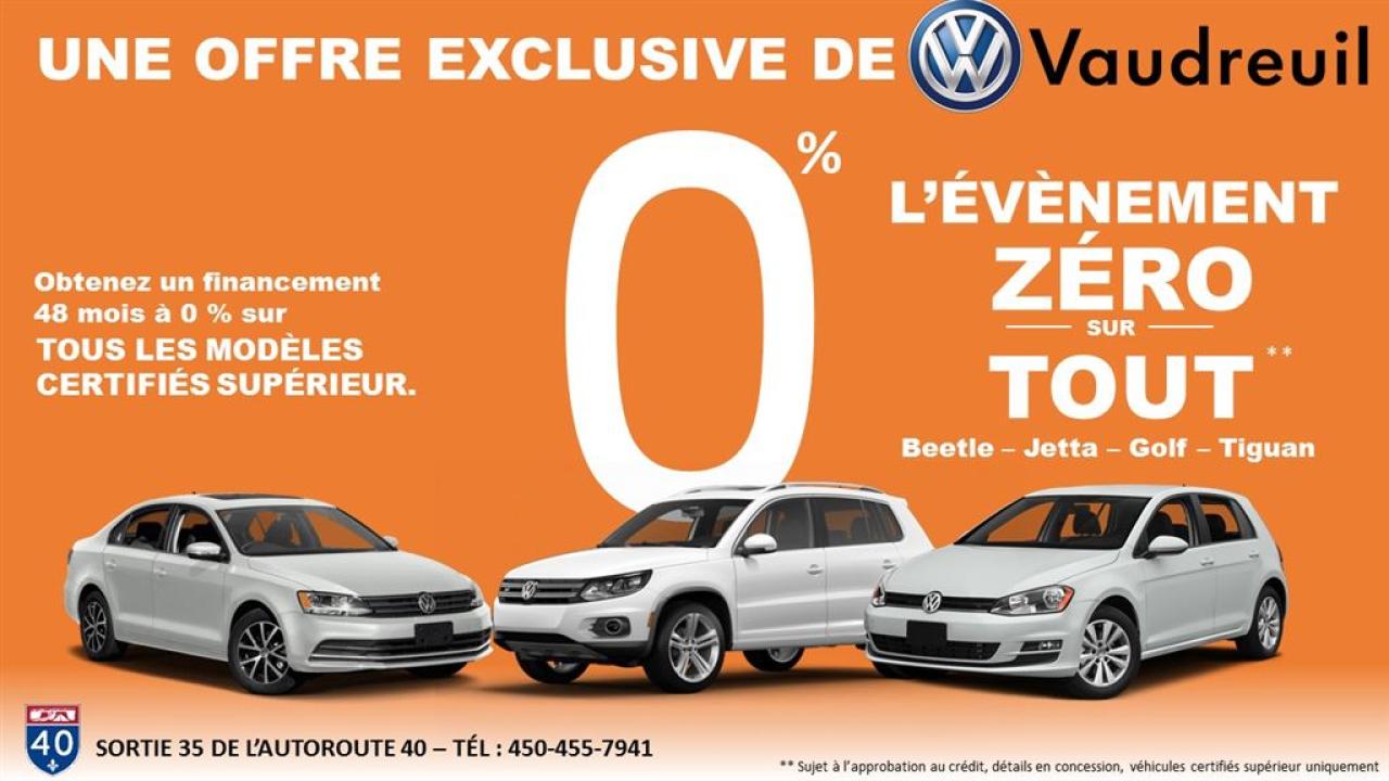 Modèle Trendline+ avec air climatisé, Jantes 17'', bancs chauffants, mirroirs électriques chauffants, régulateur de vitesse, groupe électrique. Retour de location, jamais accidenté. Possibilité d'extension de 2 ans ou 40 000 kms de la garantie d'origine avec la certification supérieure Volkswagen Aucunes obligations bancaires, aucuns frais cachés Mise en service : 13 Décembre 2013 ***************************************************************************************Bienvenue chez Vaudreuil Volkswagen, notre concession est située à seulement 10 minutes de Montréal et, ici, le personnel vous accueille dans une ambiance familiale et souriante. Nous vous offrons une livraison rapide en 24 heures*, et celle-ci est disponible partout au Québec*. Nos spécialistes de la finance vous offre la 1 ère, 2e ou 3e chance au crédit et vous obtiendrez également sur les véhicules d'occasions certifiés des taux à partir de 0 %* !! Ici, tous nos véhicules Volkswagen sont inspectés, reconditionnés avec des pièces d'origines, certifiés par nos techniciens Volkswagen, donc, garanties lorsque vous quittez la concession. Vous obtenez donc un véhicule en parfaite condition, de qualité supérieure, et ce, surpassant les normes de l'industrie! Les meilleurs avantages du marché de l'automobile vous sont maintenant offerts sous un même toit !! Véhicule d'échange ? Pas de problème! Nous achetons votre véhicule et ce, même si vous n'achetez pas chez nous! Ici chez Vaudreuil Volkswagen, on s'occupe de tout et surtout de vous! ************************************************************************************** * Détails en concession Welcome to Vaudreuil Volkswagen, our dealership is only 10 minutes from Montreal and here, the staff will greet you in a family and smiling atmosphere. We offer you a fast delivery in only 24 hours*, available across the entire Quebec territory*. Our financing specialists offer you 1st, 2nd and 3rd chance credit application and you will also obtain 0% financing on certified pre-owned vehicles!! Here, all our Volkswagen vehicles are thoroughly inspected, reconditioned with original Volkswagen parts, certified by our master technicians and covered by warranty when you leave the dealership. This way you acquire a vehicle in mint condition, high quality, surpassing all market standards! You get the best of automotive business all in one location! You would like to give your car in exchange? We buy your car even if you don't buy from us! At Volkswagen Vaudreuil, we take care of everything, especially you! *Details in store ***************************************************************************************
